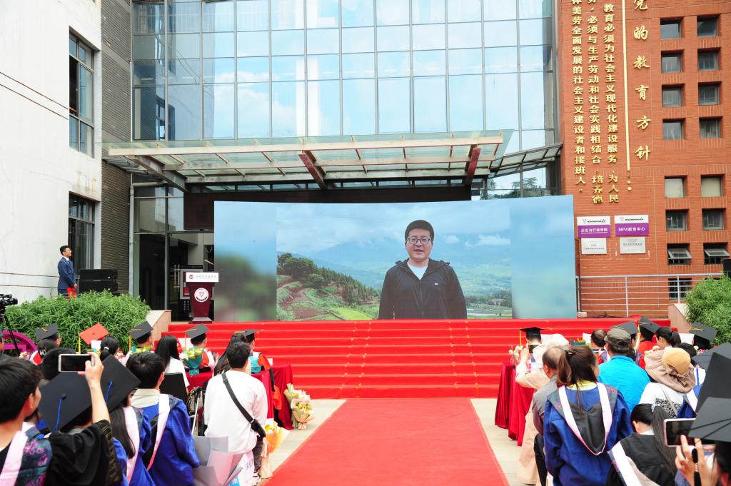 驻村工作教师代表延琳飞通过视频的方式,从德宏州梁河县为毕业学子们送来诚挚祝福。他希望同学们坚定不移听党话、跟党走,立志做有理想、敢担当、能吃苦、肯奋斗的新时代好青年,积极投身基层广阔舞台,让青春在党和人民最需要的地方绽放绚丽之花,谱写无悔青春赞歌。