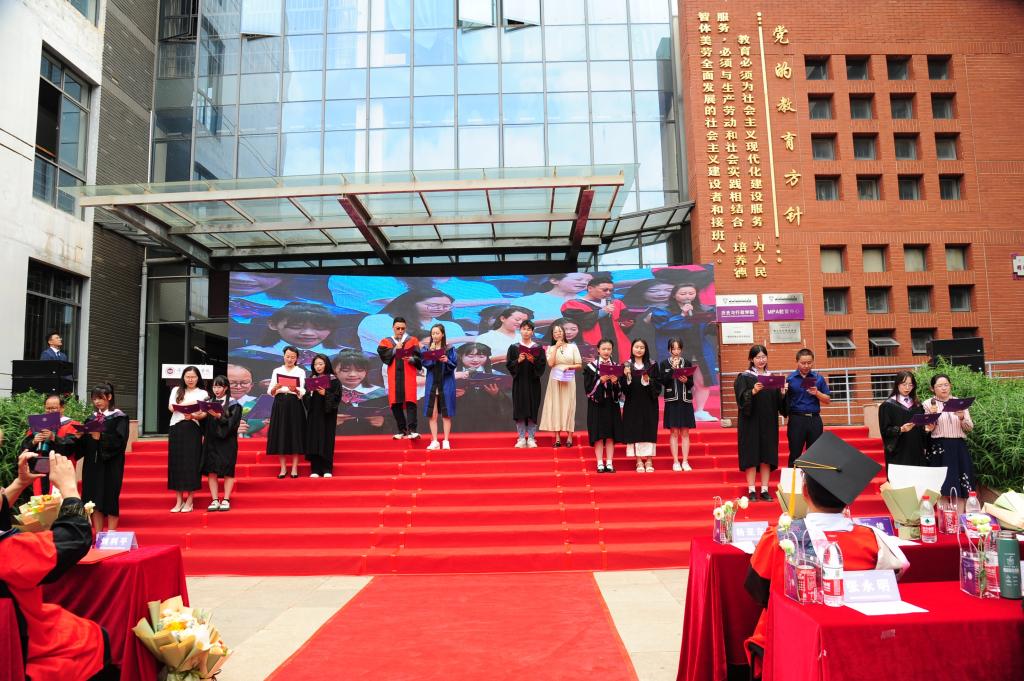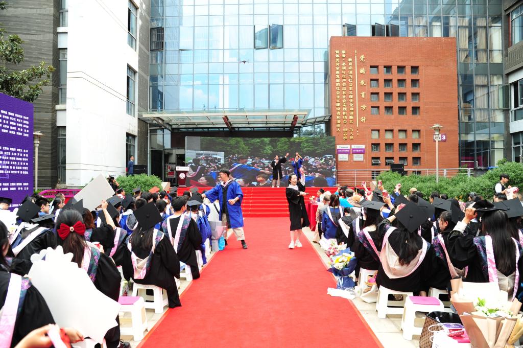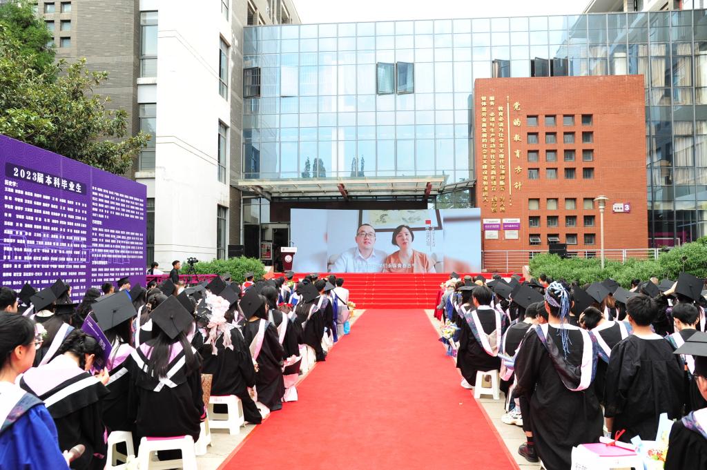 毕业生家长们通过视频方式寄语毕业生最真挚、最朴素的祝福和期待。四名学子唱响青春歌曲《干杯》,引起全场大合唱,将毕业典礼推向高潮。