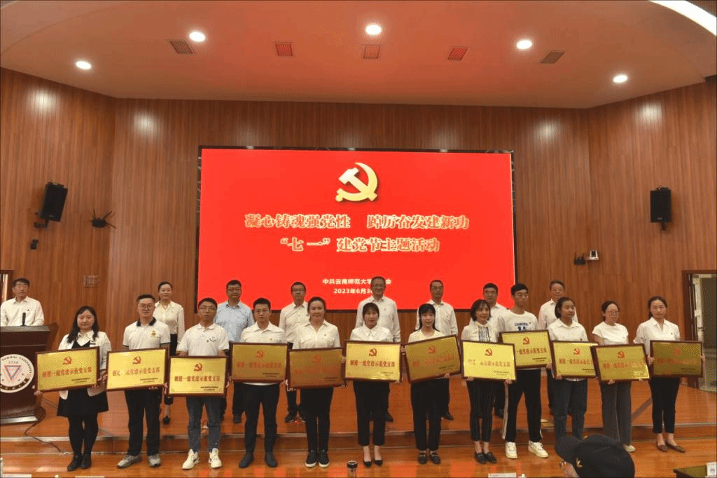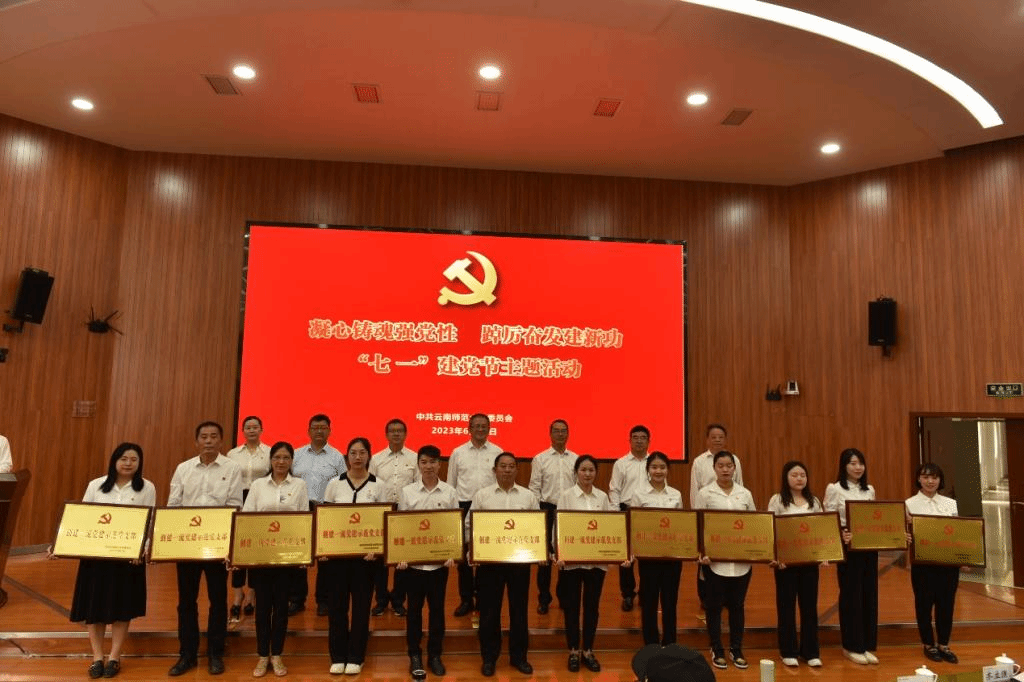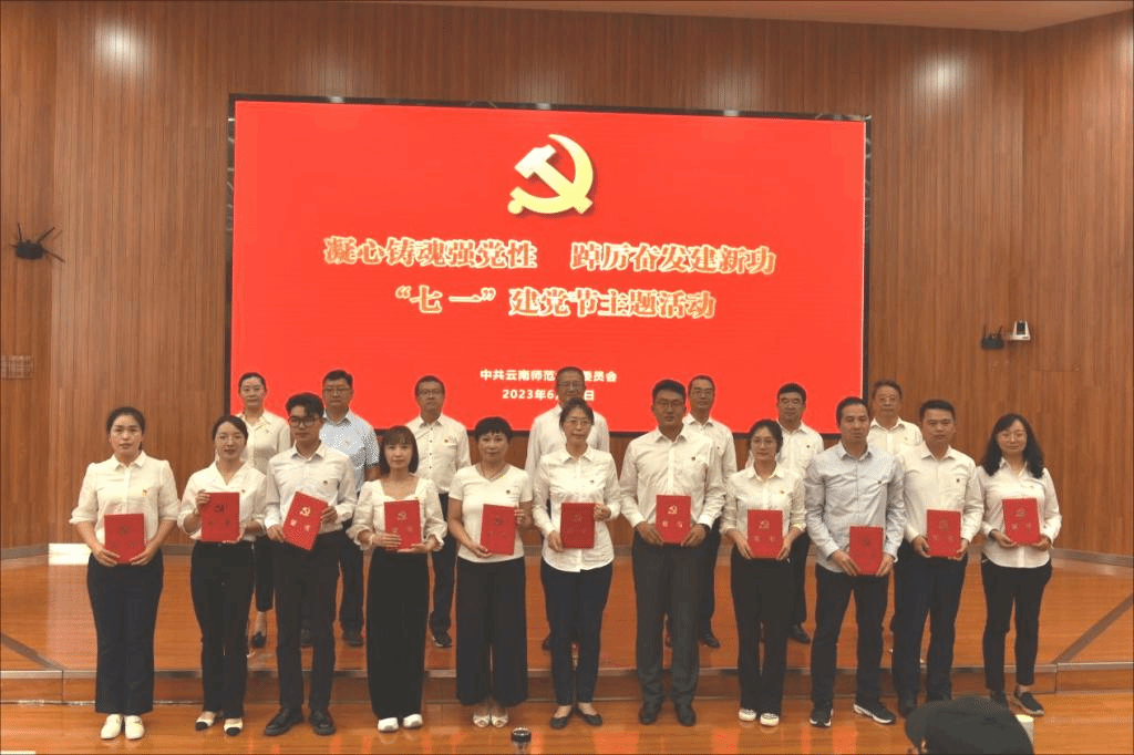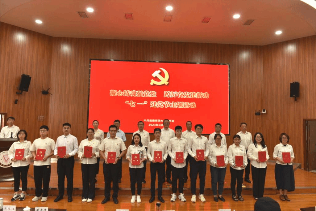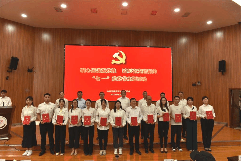 校党委书记张祖武为新党员入党宣誓暨老党员重温入党誓词仪式领誓并讲话。校党委副书记张玮主持活动并宣读获得中共中央“光荣在党50年”纪念章党员名单、《中共437必赢会员中心委员会关于选树2023年度创建“一流党建”示范党组织和表彰学习贯彻习近平新时代中国特色社会主义思想精品党课、党务工作队伍素质能力展示活动获奖人员的决定》。校党委常委向获得中共中央“光荣在党50年”纪念章的党员代表颁发纪念章,向选树的示范党组织授牌,向获奖人员颁发证书。