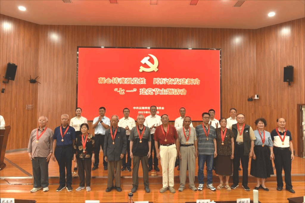 张祖武强调,荣获“光荣在党50年”纪念章的各位老党员,是学校革命建设改革各个历史时期的亲历者、见证者、建设者。广大党员干部要把老党员的风骨品质、光荣传统、优良作风学习好、传承好,从中汲取智慧、获得启迪、得到定力。要深入学习领会习近平总书记近期对党的建设和组织工作作出的重要指示精神,贯彻落实中央关于党的建设的重要思想,不断提升党建和组织工作质量,为推进强国建设、民族复兴提供坚强组织保证。一是要永远对党忠诚,自觉做习近平新时代中国特色社会主义思想的坚定信仰者、忠实践行者;二是要锤炼政治品格,加快提升干事创业的能力和本领;三是要坚持无私无畏,始终挺立在学校改革发展和攻坚克难最前列;四是要坚定从严治党,为学校高质量发展提供坚强政治保证。团结带领广大师生员工怀着感情干、扛着责任干、盯着目标干,主动服务云南“三个定位”建设和“3815”战略发展目标,落实云南教育高质量发展三年行动计划任务,贯彻党中央、省委、省委教育工委和学校党委决策部署,努力在新时代赶考路上交出优异答卷。
