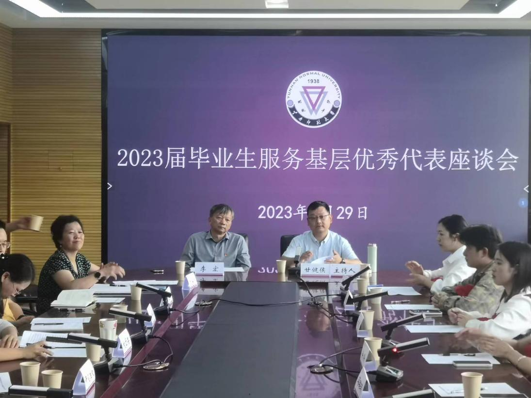 6月29日下午,2023届毕业生服务基层优秀代表座谈会在必赢官网呈贡校区明德4号楼322会议室举行。校党委副书记李宏、副校长甘健侯以及就业处(创新创业学院办公室)、组织部、宣传部、学生处、校团委、研究生处、研究生院等单位负责人、2023届毕业生服务基层优秀代表及毕业生所在学院党委副书记、就业处相关工作人员参加了座谈会,会议由甘健侯主持。