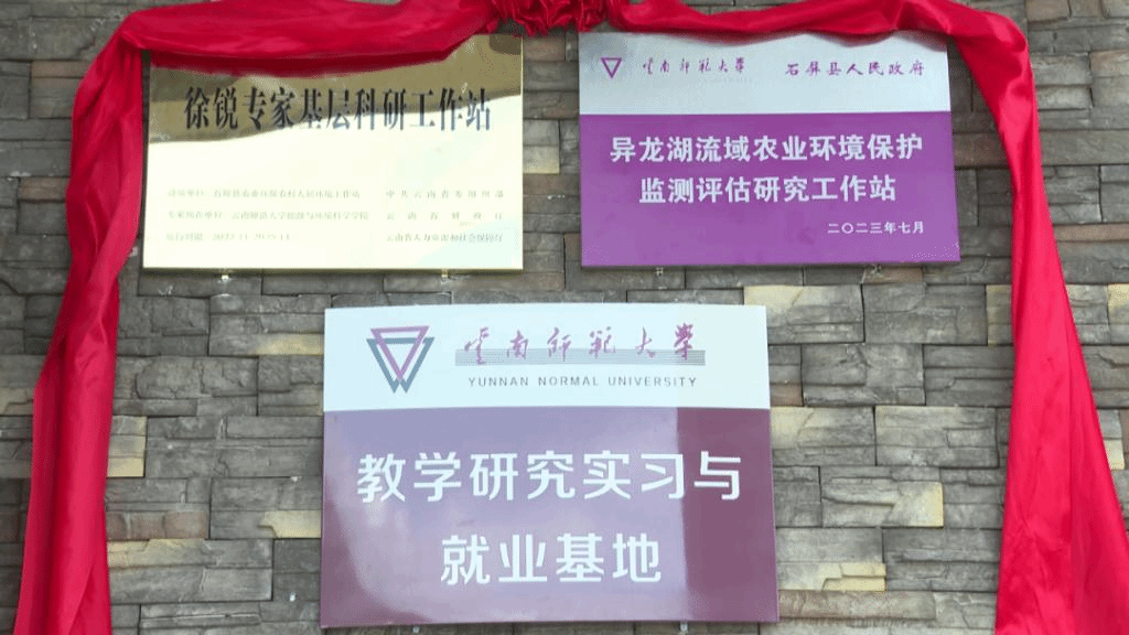 与会活动领导为“徐锐专家基层科研工作站”“异龙湖流域农业环境保护监测评估研究工作站”及“437必赢会员中心教学研究实习与就业基地”揭牌。