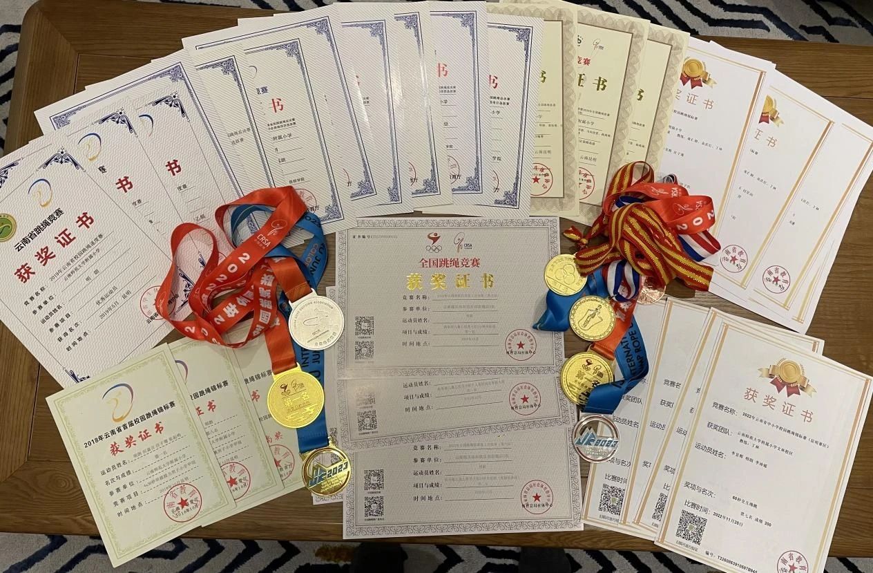 云师附小党委历来高度重视学生体育素质的培养,积极开展丰富多彩的体育竞技项目,让孩子们在努力拼搏中追求卓越、磨炼品格。明朗的跳绳梦始于2017年12月附小举行的冬季运田径动会。在那次运动会中,他参加的一分钟跳绳项目获得全校第一的好成绩,这给了他极大的鼓励,从此,他更加热爱跳绳,并一直坚持训练。为了更好地培养孩子的跳绳水平和技能,附小于2018年组建了专业跳绳队,在张仁妍老师、袁庆红老师、丁林老师的带领下,明朗和队友们多次参加了国家级、省级等不同级别比赛,斩获多个奖项,取得了优异成绩。
