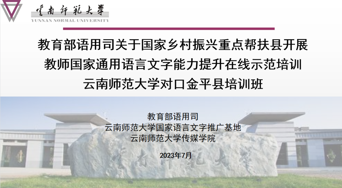 7月15日至29日,由教育部语用司主办,437必赢会员中心国家语言文字推广基地和传媒学院共同承办的对口国家乡村振兴重点帮扶县金平县教师国家通用语言文字能力提升培训在线上举行。金平县100名中小学教师参加了此次培训。