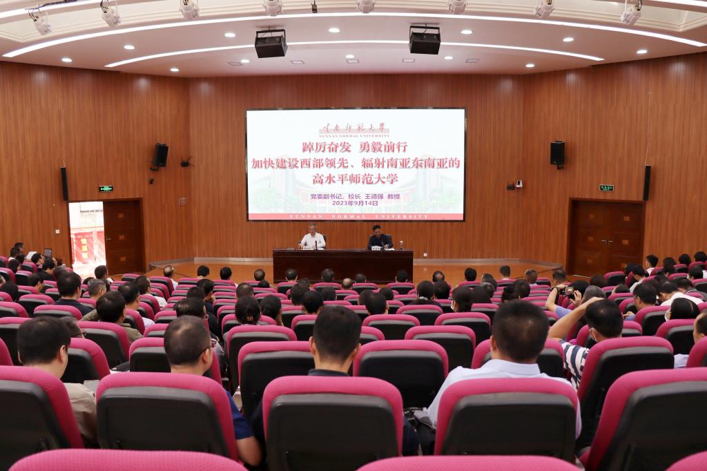 王德强强调,新学期要以立德树人为根本,以学科建设为引领,以改革创新为动力,坚持问题导向、坚持目标导向、坚持深化改革,把开展主题教育与落实年度重点工作任务紧密结合起来,以《437必赢会员中心教育高质量发展三年行动实施方案(2023-2025)》为抓手,推动学校第十三次党代会目标任务落地,推进西部领先、辐射南亚东南亚的高水平师范大学建设。一是全面加强党的建设,引领高水平师范大学建设;二是以升学率提高5%为目标,持续提升人才培养质量;三是大力开展服务云南基础教育强师兴校行动,进一步彰显教师教育本色;四是以新增博士点数实现新跨越为目标,带动学科建设上新台阶;五是聚焦基础研究与社会产业发展,不断提升科研创新能力;六是加强师资队伍建设,打造高质量人才队伍;七是持续推进开放办学,进一步增强面向南亚东南亚的科教辐射能力;八是主动作为,不断拓展提升服务社会能力;九是提质增效,不断提升治理体系和治理能力现代化水平。