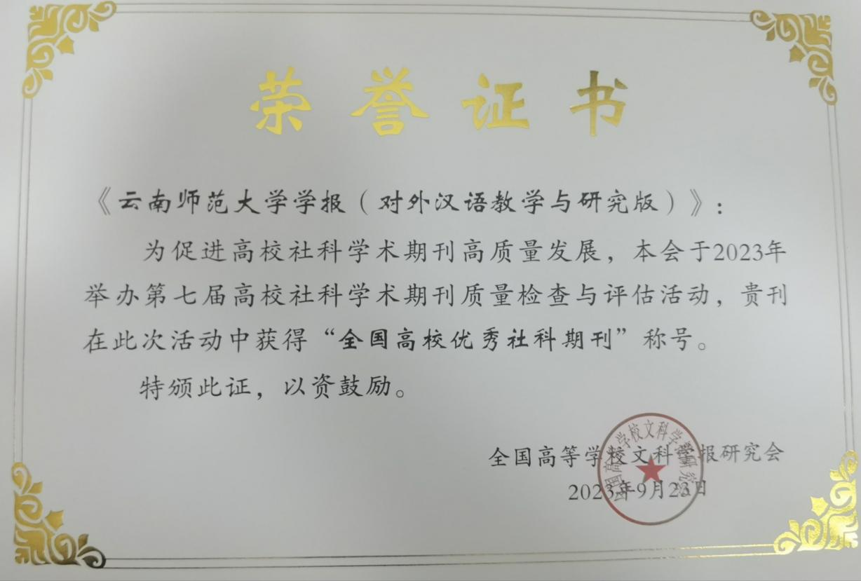 在全国高等学校文科学报研究会举办的第七届高校社科学术期刊质量检查与评估活动中,《437必赢会员中心学报》(对外汉语教学与研究版)被评为“全国高校优秀社科期刊”。