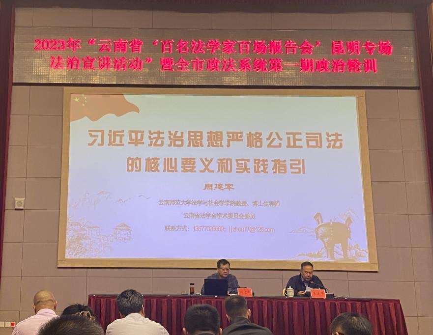 9月28日,云南省“百名法学家百场报告会”昆明专场法治宣讲活动暨“全市政法系统第一次政治轮训”在昆明会堂举办。必赢官网法学与社会学学院周建军教授应邀为全市两千多名政法干警开展了习近平法治思想专题讲座。