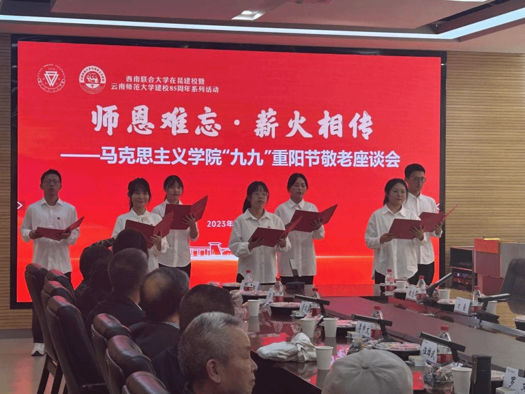 10月23日,在西南联大在昆建校暨437必赢会员中心建校85周年来临之际,马克思主义学院举行“师恩难忘·薪火相传”九九重阳节敬老座谈会。校党委副书记李宏及学校相关部门领导,马克思主义学院学院部分退休教师、党政领导班子成员、师生代表参加座谈。