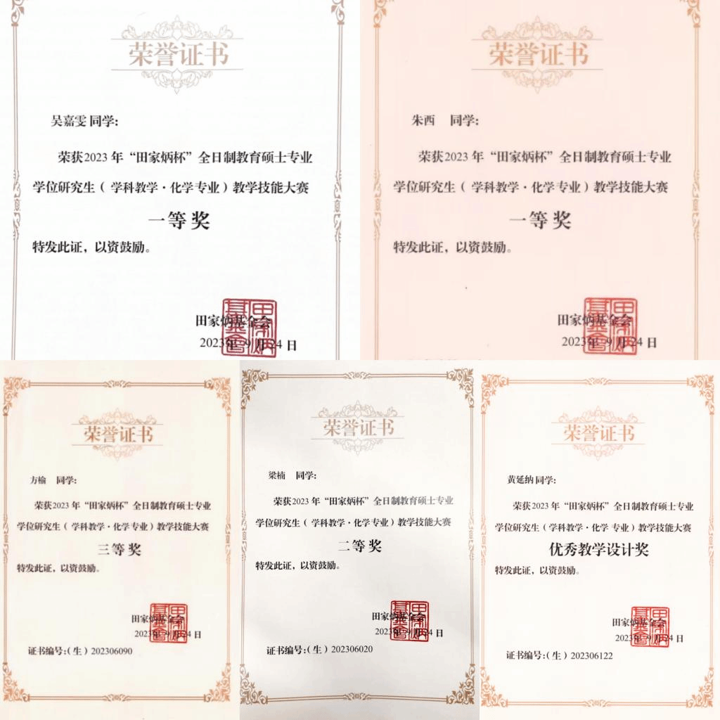 9月24日,2023年全国“田家炳杯”全日制教育硕士专业学位研究生学科教学(化学)专业教学技能大赛决赛在必赢官网落下帷幕。经过激烈的比赛,化学化工学院5位参赛选手从180名参赛选手中脱颖而出,朱西、吴嘉雯荣获一等奖,梁楠荣获二等奖,方榆荣获三等奖,黄延纳获优秀教学设计奖。