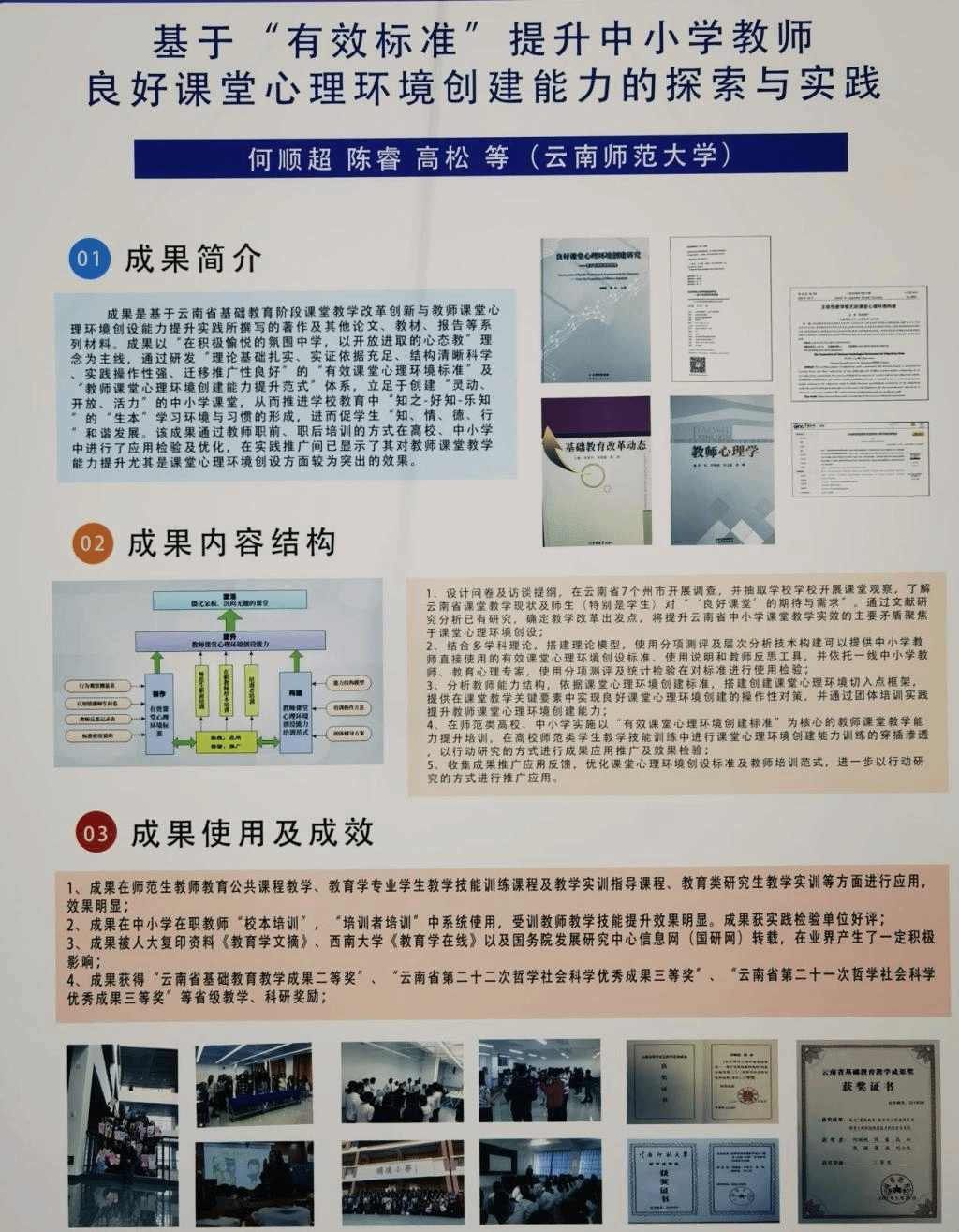 11月18日,教育学部教师何顺超、李鹏、刘将、李孝川、陈虹、李思明等应邀赴广东珠海参加第六届中国教育创新公益博览会。何顺超团队参展成果“基于有效标准提升中小学教师良好课堂心理环境创设能力的探索与实践”是云南省基础教育教学成果二等奖和云南省哲学社会科学优秀成果三等奖,为此次教博会385个高校参展项目中云南高校通过遴选的2个项目之一。该成果是教育学部教育学、心理学国家一流本科专业建设中多领域融合发展的一次有益探索,也是高校教育科研服务基础教育的一项有效实践。