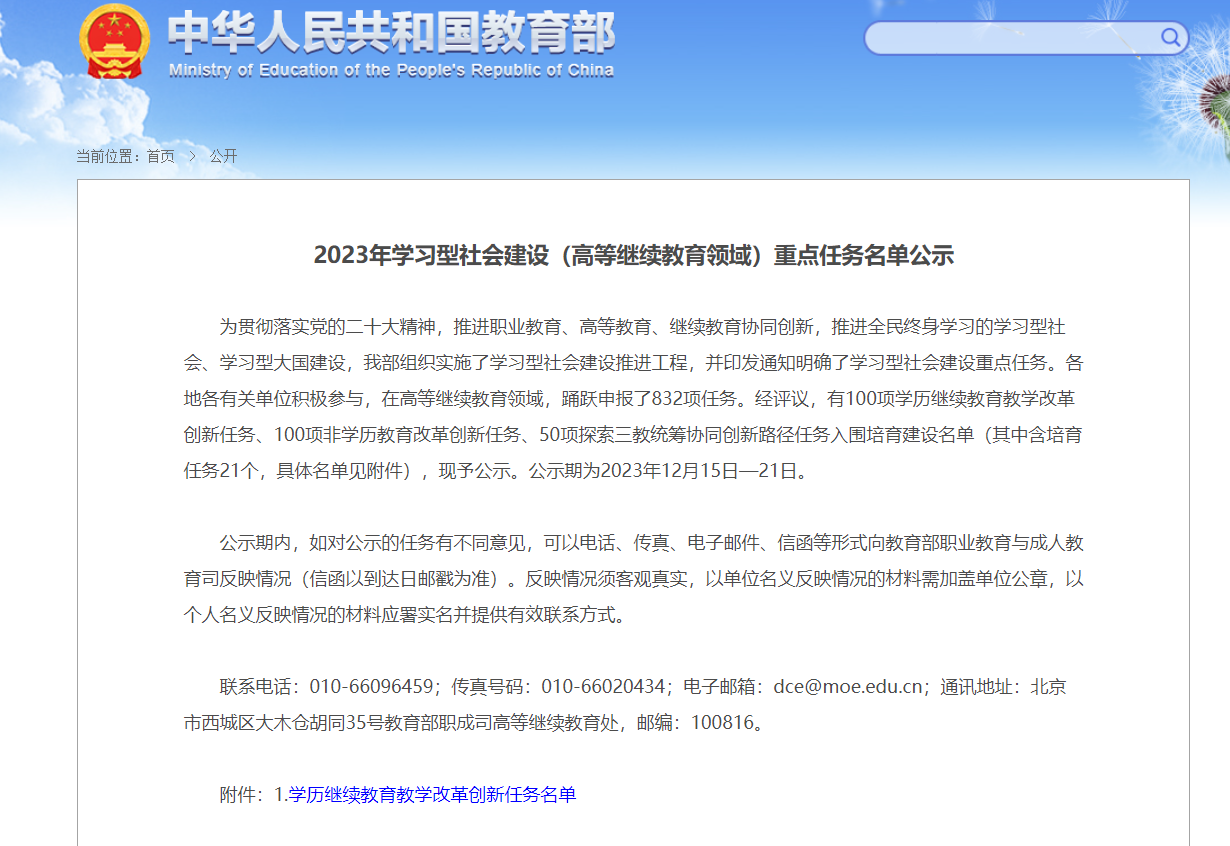 学习型社会建设推进工程是由教育部组织实施,为贯彻落实党的二十大精神,推进职业教育、高等教育、继续教育协同创新,推进全民终身学习的学习型社会、学习型大国建设的一项重点任务。全国各高校在高等继续教育领域共申报了832项任务。经评议,有100项学历继续教育教学改革创新任务、100项非学历教育改革创新任务、50项探索三教统筹协同创新路径任务入围培育建设名单。