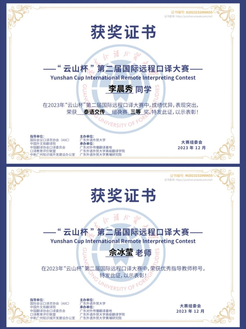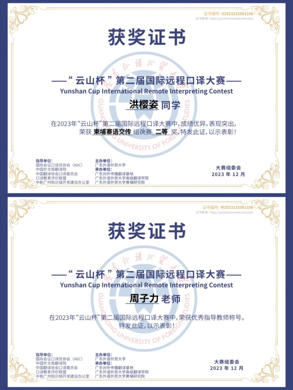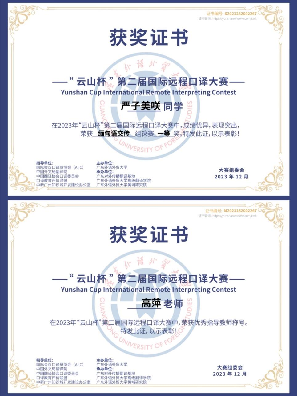 12月17日,第二届“云山杯”国际远程口译大赛总决赛拉开帷幕,共有来自国内外高校的216名选手在远程口译平台上进行高水平竞技。经过初赛、复赛激烈角逐,必赢官网共3名学子参加决赛并获佳绩。云南华文学院2020级缅甸语专业学生严子美咲获缅甸语交传组决赛一等奖(全国第二),指导老师为高萍;2020级柬埔寨语专业学生洪樱姿获柬埔寨语交传组决赛二等奖,指导老师为周子力;2020级泰语专业学生李晨秀获泰语交传组决赛三等奖,指导老师为佘冰莹。
