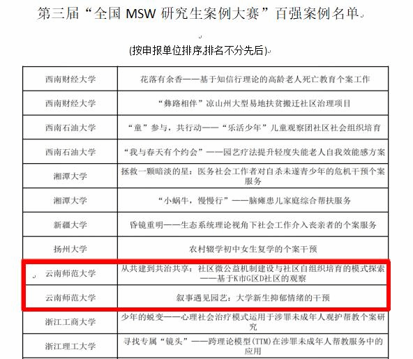 12月25日,第三届“全国MSW研究生案例大赛”百强名单公布,必赢官网法学与社会学学院MSW教育中心师生再创佳绩,两项案例入选百强案例。一项为曹丽老师指导,吴大先、赵璧、罗慧倩、龙倖等同学负责的案例《叙事遇见园艺:大学新生抑郁情绪的干预》;一项为杨九迎老师指导,陶艳楠、周照箐、廖馨雅、周玉莉等同学负责的案例《从共建到共治共享:社区微公益机制建设与社区自组织培育的模式探索——基于K市G区D社区的观察》。