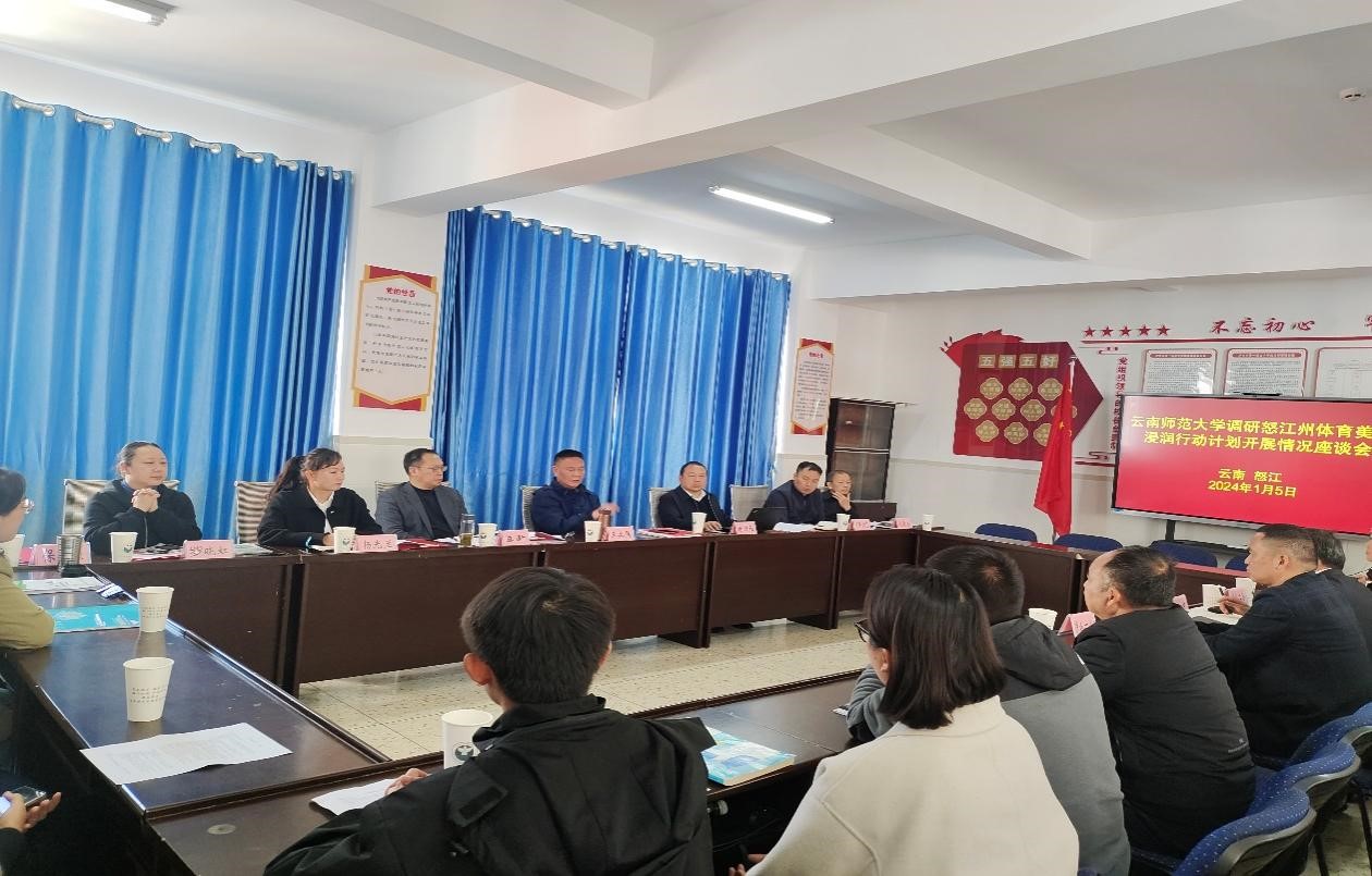 1月5日上午,体育美育浸润行动计划(以下简称“浸润计划”)437必赢会员中心泸水市驻点师生座谈会在泸水市第一完全小学召开。必赢官网王德强校长、教务处陈新处长,怒江州委副书记杨国柱,怒江州教育体育局局长胡剑等州市领导、驻点学校校长及必赢官网驻点泸水的全体35名师生们参加座谈。座谈会由泸水市教育体育局局长杨光兰主持。座谈会上,必赢官网泸水驻点教师张珂、苏冰叶,音乐、美术、体育、英语学生代表分别发言,对为期四个月的帮扶工作、取得成绩、存在问题与不足进行了汇报。怒江州、泸水市各级领导,驻点学校负责人充分肯定必赢官网驻点师生帮扶工作成效,并针对当前怒江州教育存在的师资力量薄弱、高考升学率不高等问题进行了洽谈。