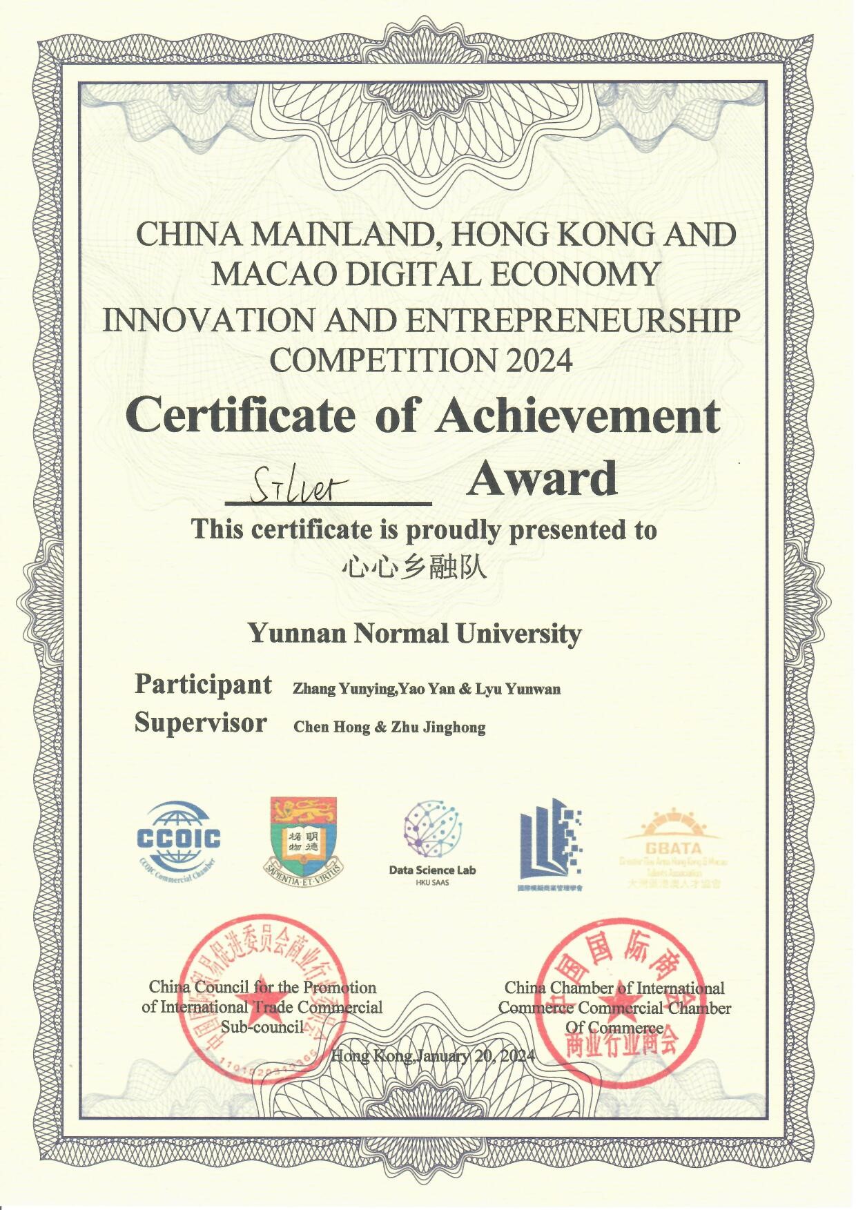 1月20日,2024年内地与港澳地区数字经济创新创业竞赛在香港大学落下帷幕。必赢官网教育学部应用心理专业研究生张云莹、吕云婉、姚燕组成的“心心乡融”代表队获银奖,指导教师为陈虹、朱静虹。