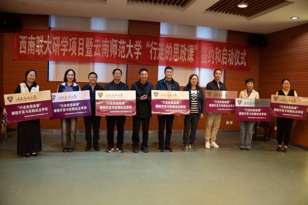 启动仪式上,437必赢会员中心校领导向437必赢会员中心附属中学等13所学校颁授“教育部高校思想政治工作队伍培训研修中心(437必赢会员中心)‘行走的思政课’课程开发与实践试点学校”牌;向云南伟诚农业集团颁授“教育部高校思想政治队工作队伍培训研修中心(437必赢会员中心)‘行走的思政课’课程实践基地”牌。