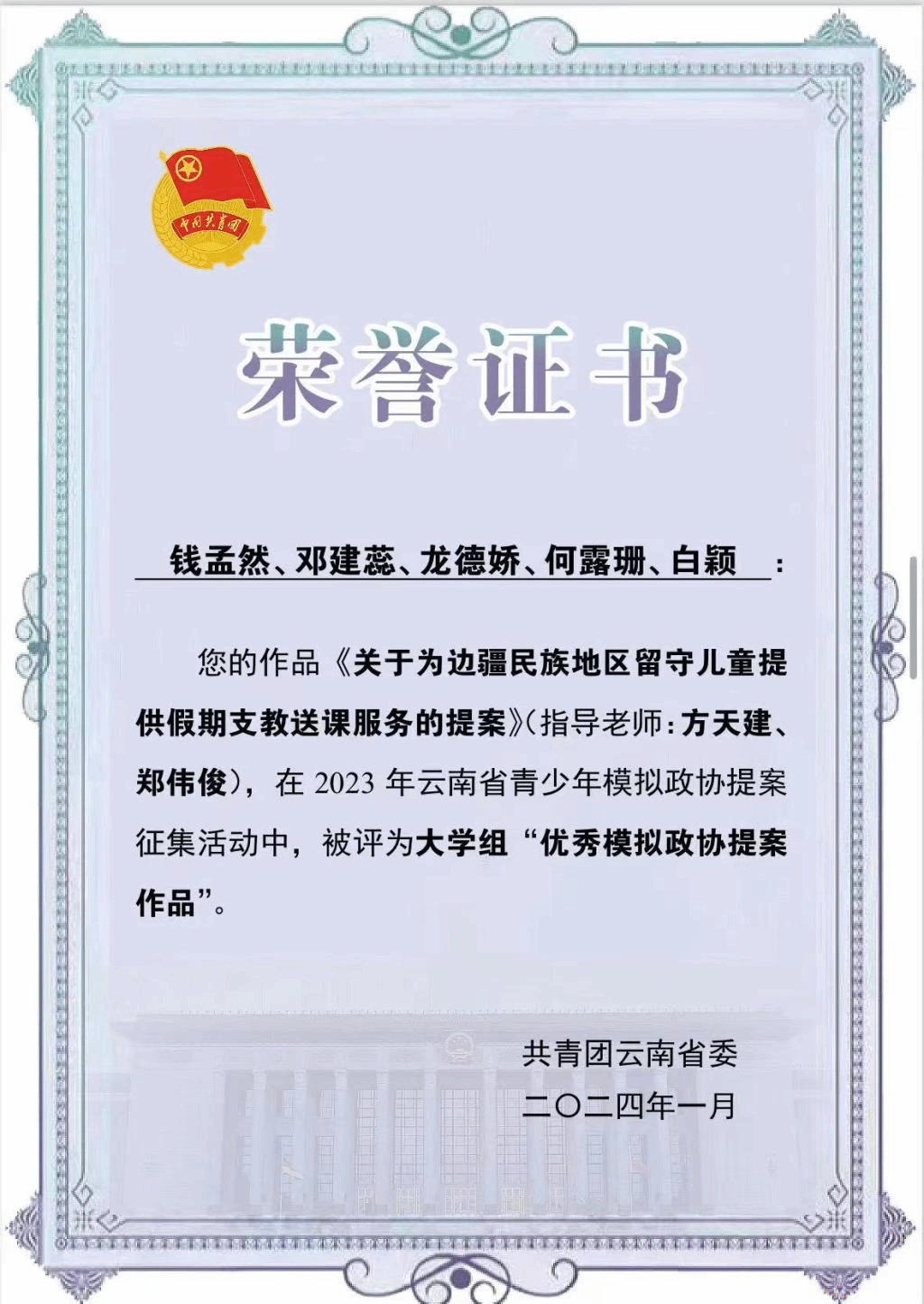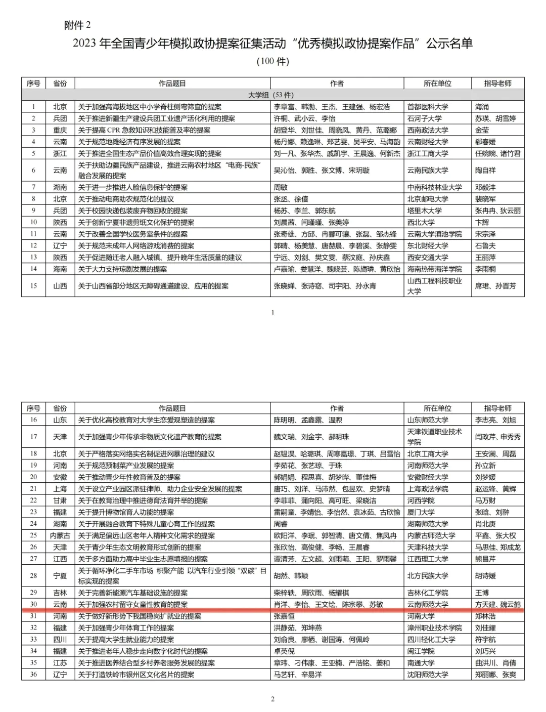 近日,2023年全国青少年模拟政协提案征集活动评审结果公布。由437必赢会员中心历史与行政学院方天建、魏云鹤老师指导,肖洋、李怡、王文绘、陈宗攀、苏敏同学团队提交的“关于加强农村留守女童性教育的提案”从参与全国评审的875件模拟提案作品中脱颖而出,获评“优秀模拟政协提案作品”。此前,由437必赢会员中心方天建、郑伟俊老师指导,钱孟然、邓建蕊、龙德娇、何露珊、白颖同学提交的“关于为边疆民族地区留守儿童提供假期支教送课服务的提案”获云南省青少年模拟政协提案“优秀模拟提案作品”。
