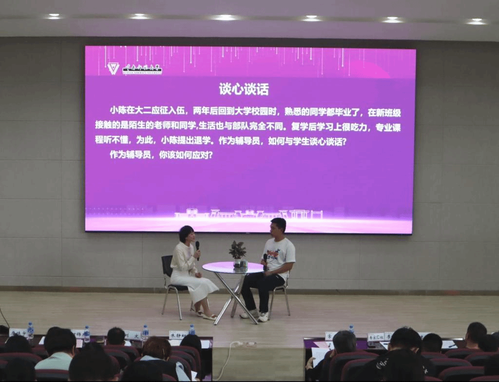 数学学院刘欣婷、职教学院曾尚芸两位老师围绕学生管理工作案例,聚焦问题分析、解决措施、启示拓展等方面进行研讨交流,同时开展谈心谈话情景模拟,再现了辅导员老师与学生沟通交流的场景。各环节结束后,专家组成员就本次研讨和谈话依次提问,辅导员老师积极作答。