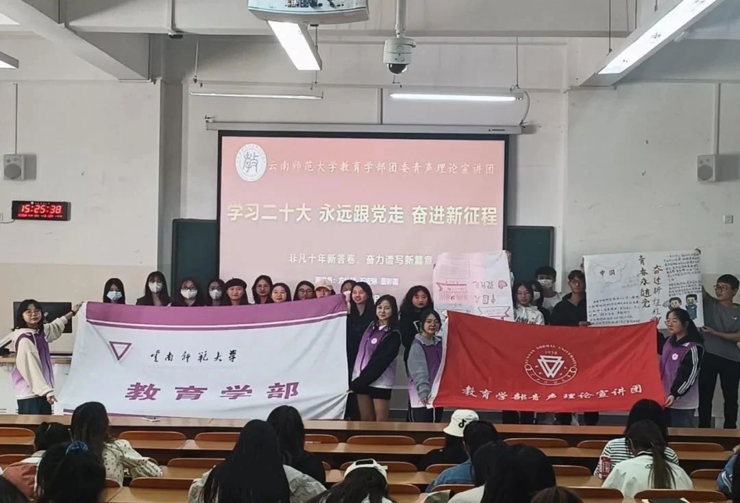 “青声理论宣讲团”成立于2021年6月,是一个集思想性、引领性、特色化的“学习+志愿服务”型学生组织。宣讲团指导教师为教育学部党委书记禹紫灵、党委副书记朱静虹、团委副书记闫晓飞,现有团队成员50余人,由本硕博不同专业背景的在校大学生组成,致力于打造青年大学生思想引领的前沿阵地。宣讲团以“讲好中国故事 传播好中国声音”为理念,着力“六个讲好”,即讲好习近平新时代中国特色社会主义思想、讲好党的二十大精神、讲好习近平总书记关于教育的重要论述、讲好西南联大教育救国的故事、讲好张桂梅老师的故事、讲好云南师大优秀师范生的故事。宣讲团采取线上线下相结合的方式,用好“三下乡”“返家乡”等社会实践渠道,采用“1+N”模式,以昆明市呈贡区为中心,辐射全省大中小学生群体、周边社区居民,让党的创新理论“飞入寻常百姓家”。截至目前,团队共完成宣讲250多场,累计志愿时长700余小时,宣讲受众面3500余人次。