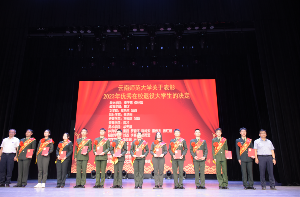 与会校领导为2023年全体退伍复学学生颁发“优秀退伍大学生”荣誉证书。