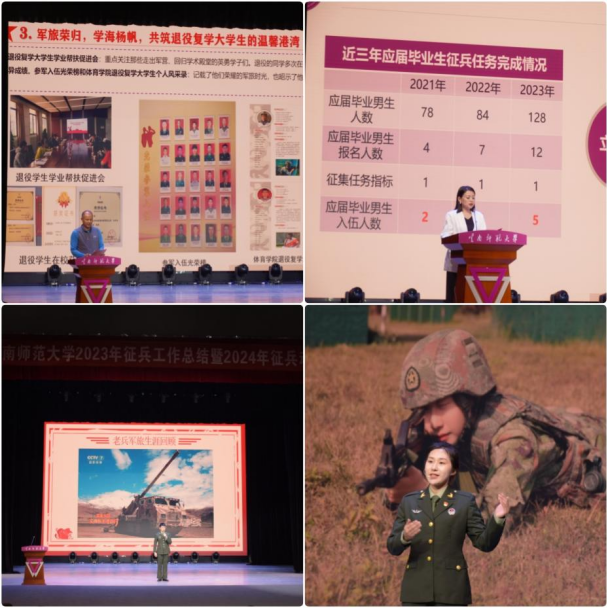 体育学院党委书记华致雄、职业技术教育学院党委书记刘虹作为2023年征兵工作先进单位代表分别交流发言。2023年退伍复学学生代表邹勋、宫砚琪分享了自己的从军历程和参军感悟。