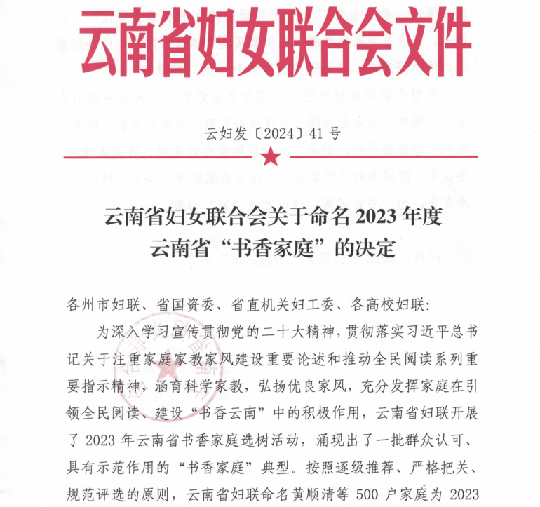 为深入学习宣传贯彻党的二十大精神,贯彻落实习近平总书记关于注重家庭家教家风建设重要论述和推动全民阅读系列重要指示精神,涵育科学家教,弘扬优良家风,充分发挥家庭在引领全民阅读、建设“书香云南”中的积极作用,云南省妇联开展了2023年云南省书香家庭选树活动,涌现出了一批群众认可、具有示范作用的“书香家庭”典型。