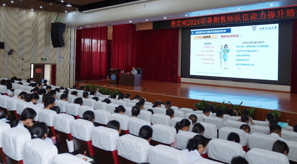 副校长甘健侯教授应邀为“德宏州2024年暑期教师队伍能力提升培训”260多名学员进行教育数字化专题讲座培训,主题为《边疆民族地区教育数字化赋能教育教学发展的思考与应用实践》,讲座围绕教育数字化发展与挑战、数字化与教育教学深度融合、智能技术赋能课堂教学等多个方面,深入探讨教育数字化转型背景下教育观念转变和教学方式变革需要教师具备的新技术和新能力。