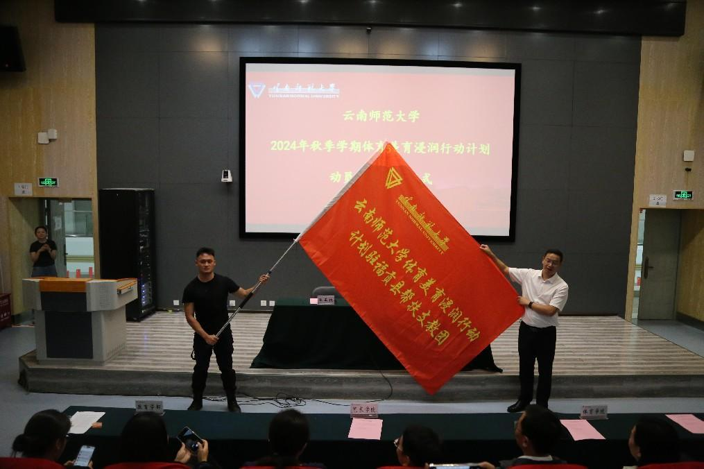 陈正权为泸水市、福贡县、贡山县三个驻点帮扶支教团授旗并作动员。陈正权强调,体育美育浸润行动计划要根据教育部与云南省浸润行动计划具体要求,紧扣学校“151”战略行动计划,深入思考“为什么去”“去干什么”“能留下什么”三个问题。希望每位师生要严守纪律、修好身心、处好关系、做好工作。