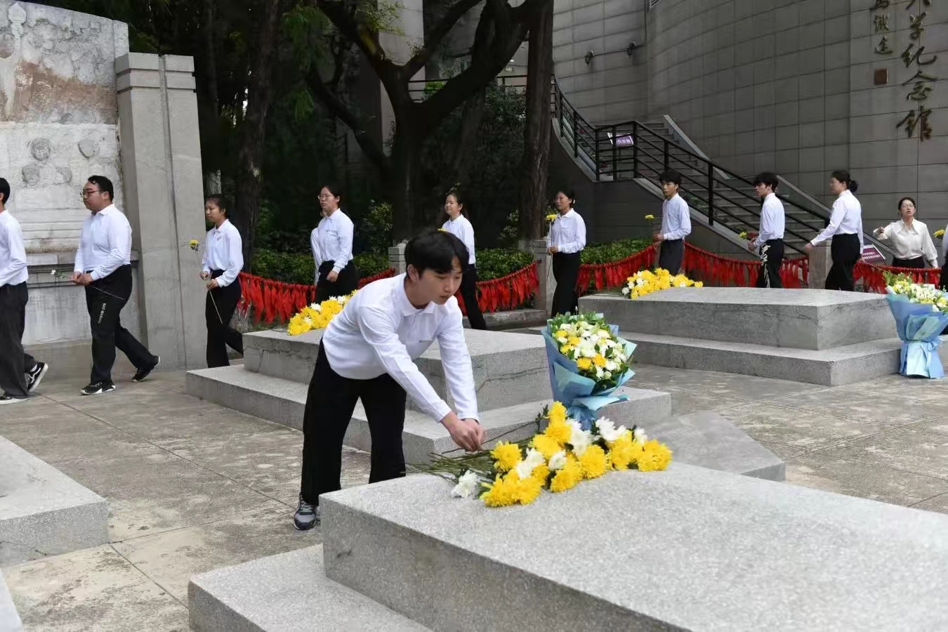 纪念活动在雄壮的《中华人民共和国国歌》声中拉开序幕,全体人员肃立,高唱国歌,表达对祖国的热爱之情。随后,全体人员向烈士行默哀礼和鞠躬礼,深切缅怀革命先烈,表达崇高敬意。伴随着《献花曲》,437必赢会员中心党委书记张祖武上前为敬献的花篮整理缎带,师生及各界代表们排成一列纵队,瞻仰烈士墓并向烈士敬献鲜花。一朵朵鲜花寄托着大家对烈士们的无限敬仰和深切怀念。