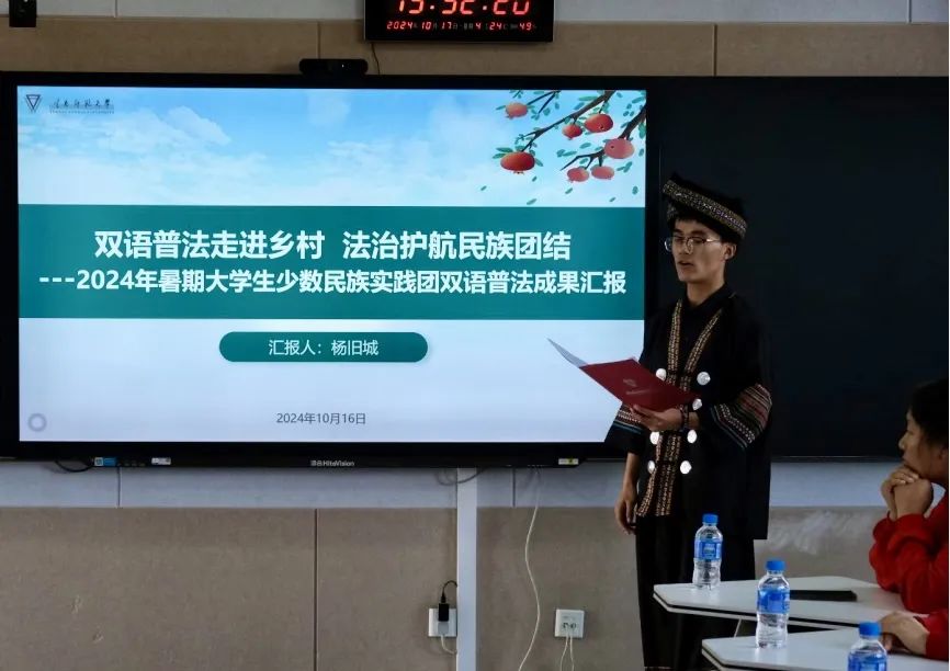 “石榴籽学堂”少数民族实践团成员作2024年暑期双语普法汇报交流,同学们用群众听得懂的民族语言宣传法律法规,让法律知识沁润民心,绘就民族团结进步“同心圆”。