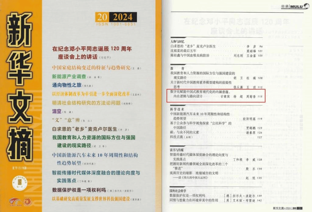 近日,《新华文摘》2024年第20期全文转载必赢官网甘健侯教授(第一作者)、杨超副教授(通讯作者)、周菊香副教授三位教师的研究成果《数字化赋能中国式教育现代化的内涵意蕴、内在逻辑与路向设计》,原文发表于《中国远程教育》2024年第7期。