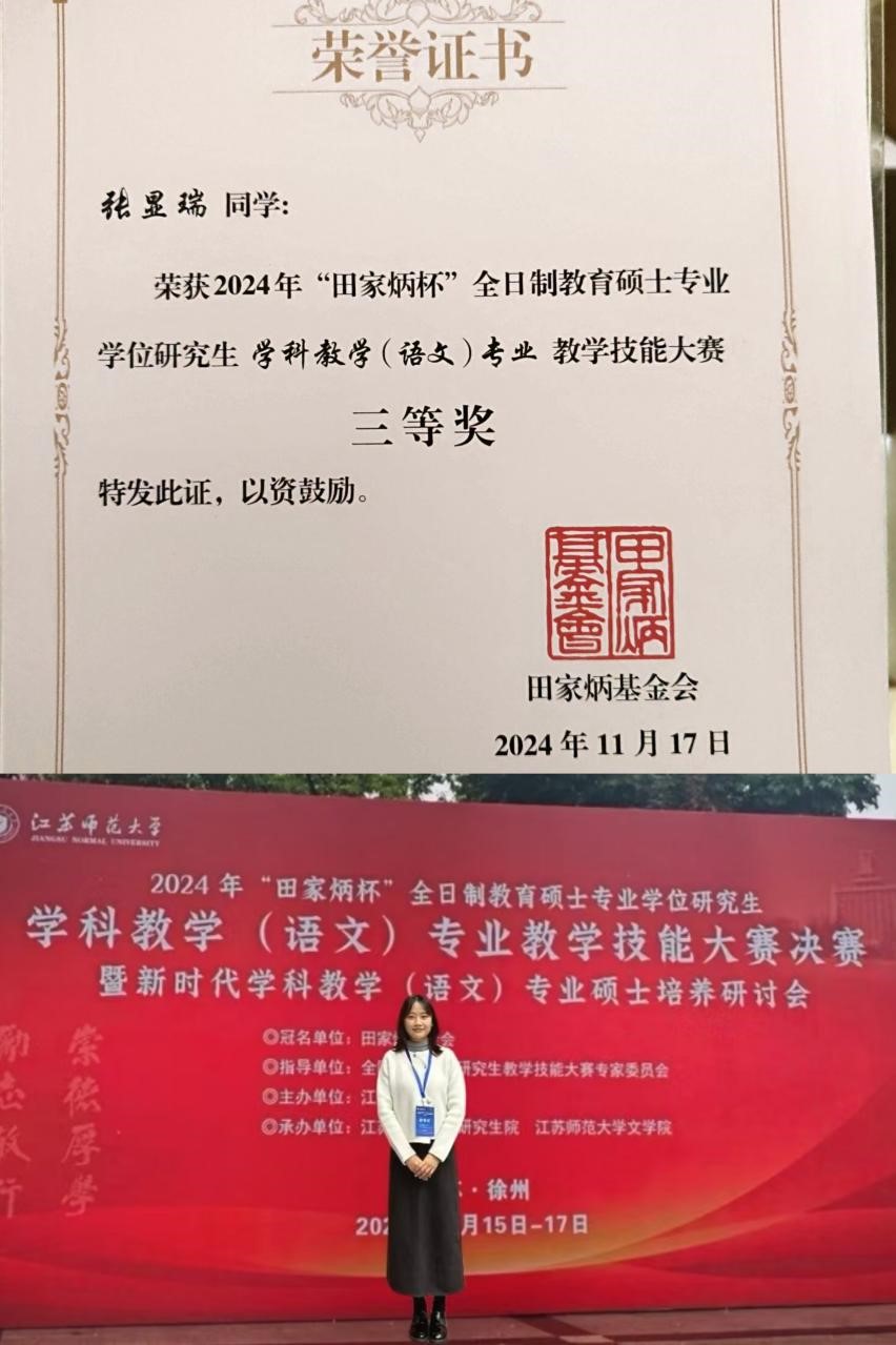 11月15日-17日,2024年全国“田家炳杯”全日制教育硕士专业学位研究生学科教学(语文)专业教学技能大赛决赛在江苏师范大学泉山校区举办。必赢官网文学院2022级学科教学(语文)专业硕士研究生张显瑞同学荣获三等奖。