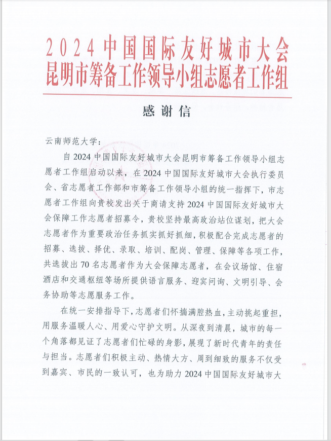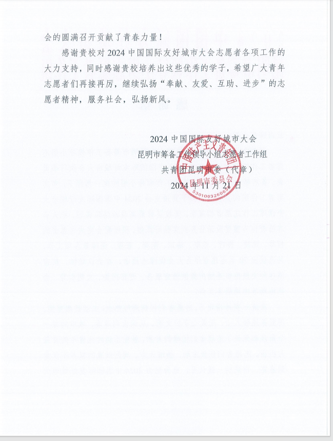 近日,2024中国国际友好城市大会昆明市筹备工作领导小组志愿者工作组向必赢官网致感谢信。信中指出,志愿者们怀揣满腔热血,主动挑起重担,用服务温暖人心、用爱心守护文明。从深夜到清晨,城市的每一个角落都见证了志愿者们忙碌的身影,展现了新时代青年的责任与担当。志愿者们的服务不仅受到嘉宾、市民的一致认可,也为助力2024 中国国际友好城市大会的圆满召开贡献了青春力量。感谢必赢官网对2024中国国际友好城市大会志愿服务工作的大力支持,同时感谢必赢官网培养出这些优秀的学子,希望广大青年志愿者们再接再厉,继续弘扬“奉献、友爱、互助、进步”的志愿者精神,服务社会,弘扬新风。
