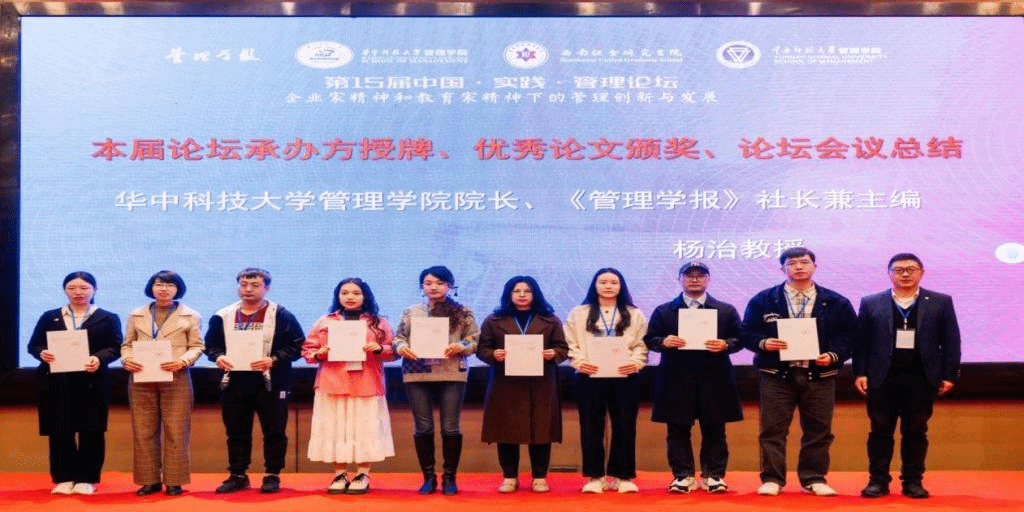 论坛共收到投稿126篇,宣读论文59篇,评选出优秀论文9篇。华中科技大学管理学院院长、《管理学报》社长兼主编杨治教授为优秀论文获奖者颁奖,并为下一届论坛承办方深圳大学授牌。深圳大学管理学院MBA中心主任崔世娟教授对深圳大学承办情况进行介绍,并盛情邀请与会嘉宾2025年相聚深圳。