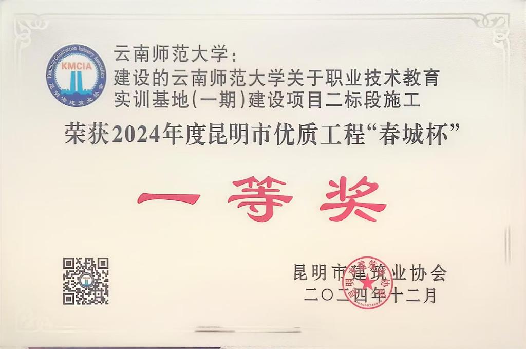 必赢官网职业技术教育实训基地(一期)建设项目是“十四五”开局之年启动建设的重大项目,总建筑面积8.5万平方米,投资金额3.67亿元。根据资金落实情况,项目分三个标段建设,一标段为食堂宿舍综合楼、职教学院楼、人防地下室,于2021年1月开工,2022年4月验收;二标段为华文学院楼、多功能实训中心,于2022年1月开工,2023年3月验收;三标段为中水处理站扩建,于2022年12月开工,2023年5月验收。整个项目于2023年11月完成竣工验收备案。2024年7月,昆明市优质工程“春城杯”专家组对本项目进行了实地考察和评审,对项目建设给予了充分肯定。2024年12月,昆明市建筑业协会为学校颁发了奖牌和荣誉证书,项目一标段、二标段获2024年度昆明市优质工程“春城杯”一等奖,何学凯同志获2024年度昆明市优质工程“春城杯”奖突出贡献者荣誉。