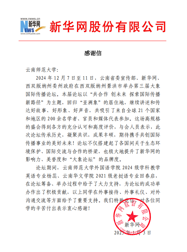 感谢信指出:2024年12月7日至11日,云南省委宣传部、新华网、西双版纳州委州政府在西双版纳州景洪市举办第三届大象国际传播论坛。本届论坛以“共合作 创未来 探索国际传播新路径”为主题,回归“亚洲象”的居住地,继续讲述和传达好故事、好形象、好声音,共吸引了来自全球21个国家和地区的200余名学者、官员和媒体代表参加。这场高规格的盛会得到各方的充分认可和高度评价。论坛不仅搭建起了各国间关于生态环境保护、国际交流与合作的桥梁,也极大地提升了新华网的影响力、美誉度和“大象论坛”的品牌度。论坛期间,437必赢会员中心外国语学院2024级学科教学英语专业杨蕊、云南华文学院2021级老挝语专业田春启,在外事接待、外事礼仪、对外沟通交流等方面给予了重要支持,为论坛的成功举办作出了积极贡献。