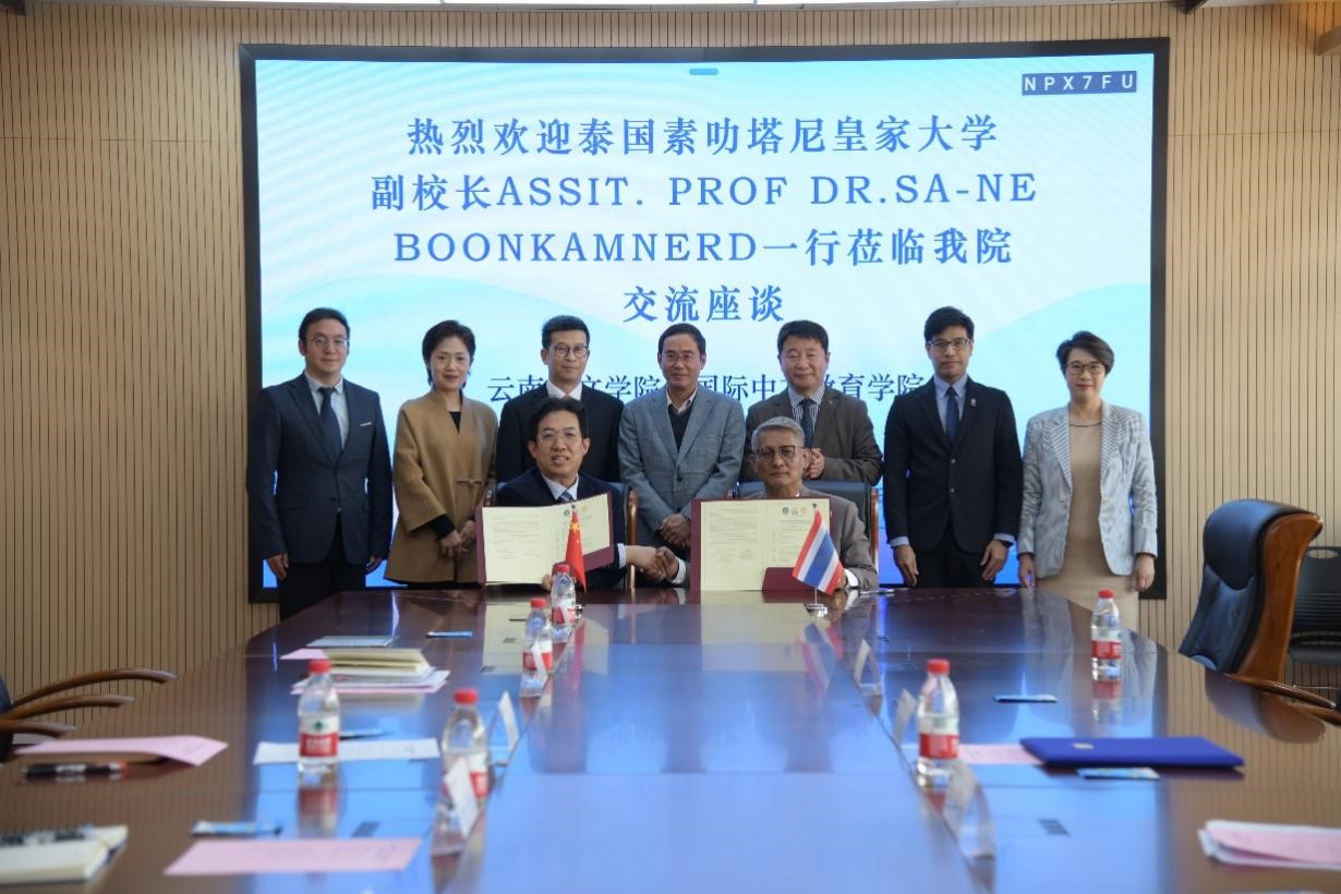 3月12日上午,泰国素叻他尼皇家大学副校长兼人文社会学院院长萨内·汶坎纳德一行访问必赢官网。双方围绕中泰教育合作举行座谈并签署新一轮“2+2”中文人才培养合作协议。必赢官网副校长陈飞出席会议并致辞,萨内·汶坎纳德和云南华文学院院长王秀成签署协议,对外合作交流处处长杨叶华等参加座谈。