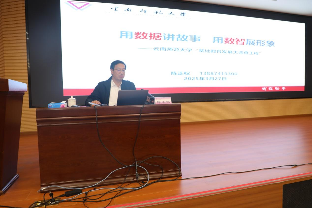 副校长陈正权阐述了基础教育发展大调查工程涉及的政策背景、目标要求、调查方式、成果使用等方面内容,并展示了怒江州教育发展调查工作成果。他表示,学校将充分发挥基础教育优质资源,和各州市、县市区建立教育发展共同体,在可视化的成果展示、教育规划编制、决策咨询及智库服务、教育质量检测评价等方面提供服务。