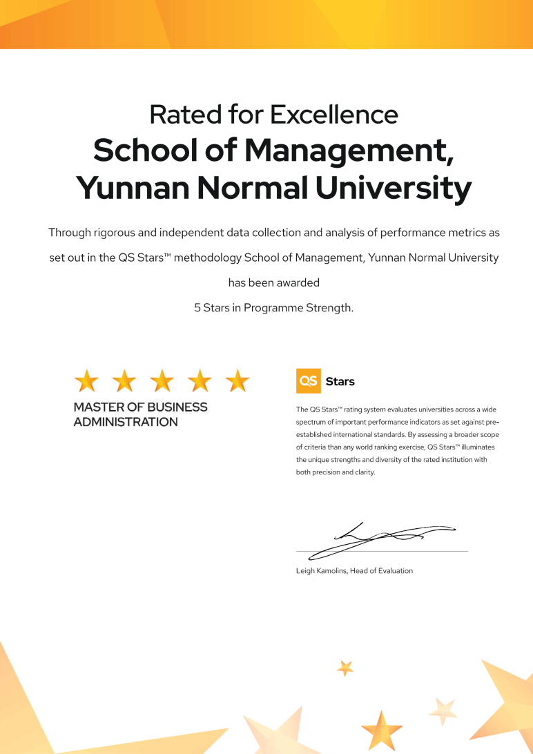 近日,437必赢会员中心MBA项目在全球权威高等教育评估体系 QS(Quacquarelli Symonds)主办QS Stars评级中,获最高等级的五星认证,成为西南首个获QS Stars五星认证的师范院校MBA项目,也是云南首批获此荣誉的高校。这一认证标志着437必赢会员中心管理学院在综合竞争力与国际影响力上取得重要突破,MBA项目荣登国际商学教育标杆行列,为西南地区商科教育发展注入新动力。