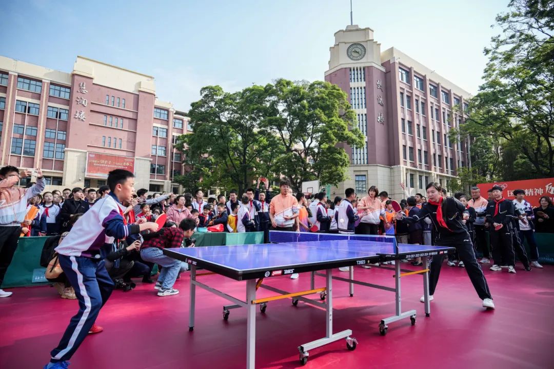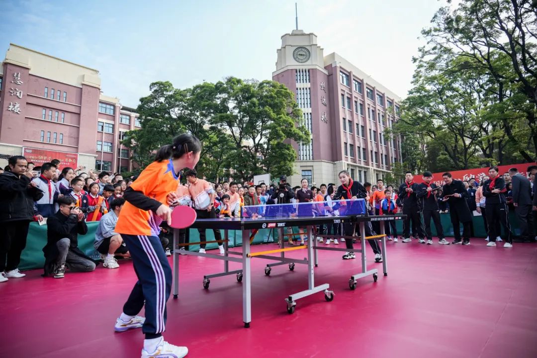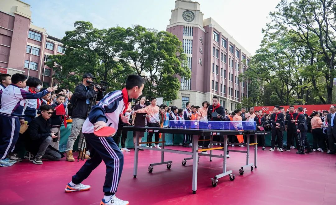 4位奥运冠军和学校乒乓球队队员们开展了一场精彩的友谊赛。同学们手持球拍、全神贯注,与奥运冠军同场竞技、提升自我。奥运冠军希望同学们在未来的训练和比赛中,将不服输的精神贯彻到底,现场欢呼声和呐喊声不断。