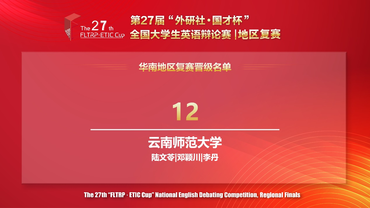 4月12日至13日, 第27届“外研社·国才杯”全国大学生英语辩论赛华南地区复赛在线上举行。必赢官网2021级英语专业本科生邓颖川、李丹同学组成的英辩代表队,在外国语学院陆文苓老师的精心指导下,与来自福建、广东、广西、港澳台、湖北、湖南、江西、云南、贵州、海南等高校128支队伍同场比拼,经过五轮积分循环赛的竞争,脱颖而出,以全场排名12,云南省排名第1的优异成绩,荣获华南赛区金奖,成功晋级全国决赛,在此项赛事中实现重要突破,是必赢官网选手首次入围国赛。