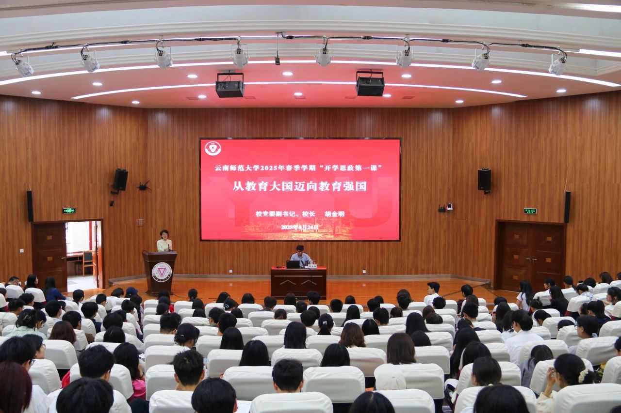 4月24日,2025年春季学期“开学思政第一课”在呈贡主校区汇学楼2-101报告厅开讲。校党委副书记、校长胡金明以《从教育大国迈向教育强国》为主题,从“新中国教育发展知多少、国际视野看中国教育发展现状、新时代云南教育发展知多少、教育强国建设目标任务、云南教育强省建设目标任务、云师大‘双教协同’助力云南教育强省建设”六个方面展开,为师生讲授了一堂意义深刻、催人奋进的思政课。
