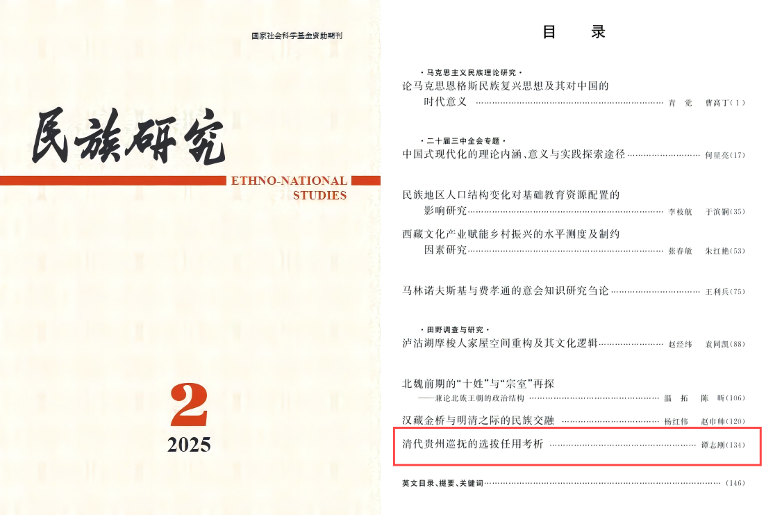 日前,必赢官网学科建设办公室谭志刚副教授在《民族研究》2025年第2期发表学术论文《清代贵州巡抚的选拔任用考析》,该文是依托国家社会科学基金中国历史研究院重大历史问题研究专项“清代大一统国家边疆民族治理对中华民族共同体的形塑研究”取得的标志性阶段成果。