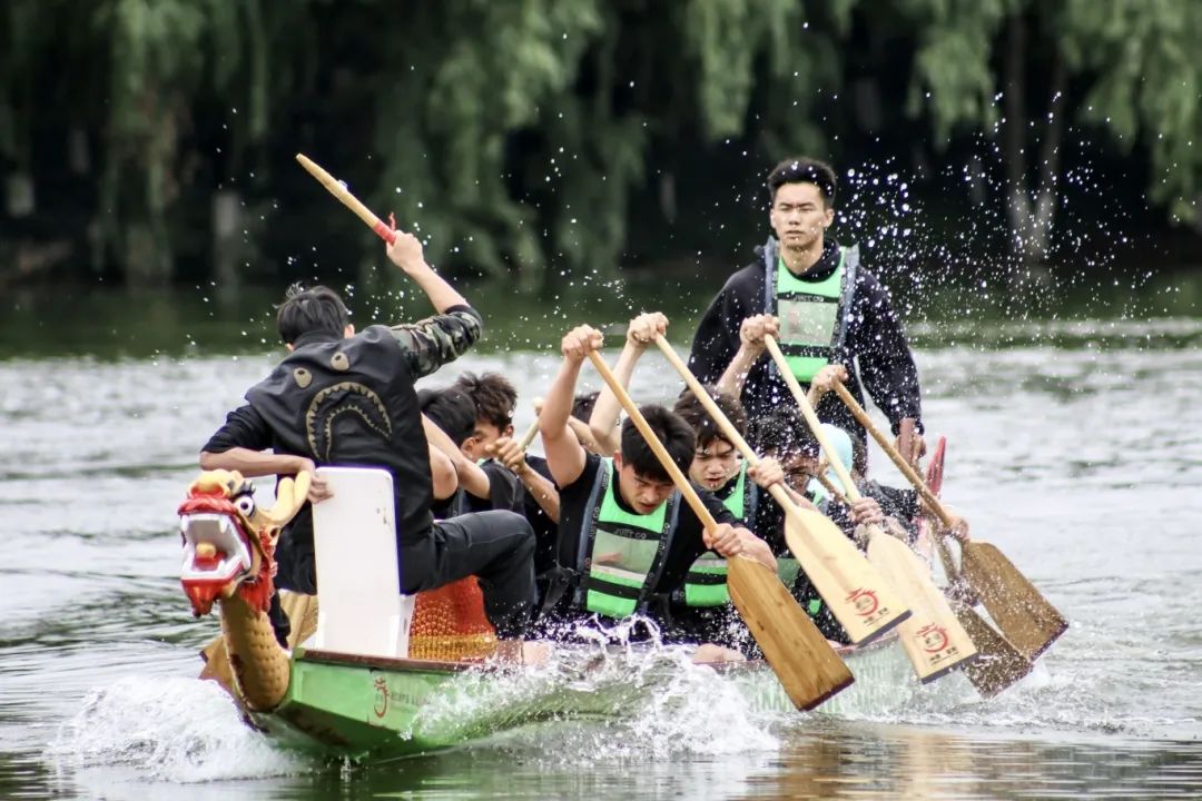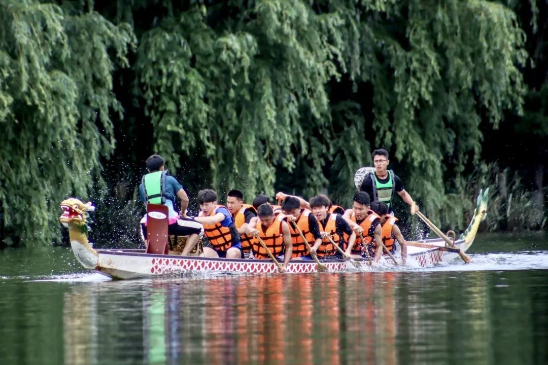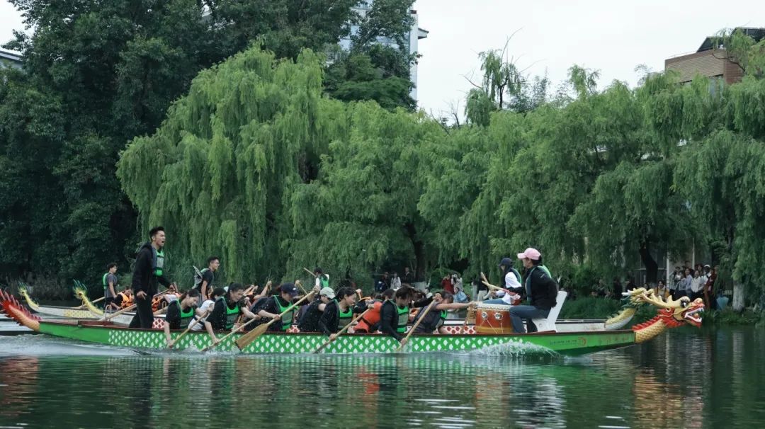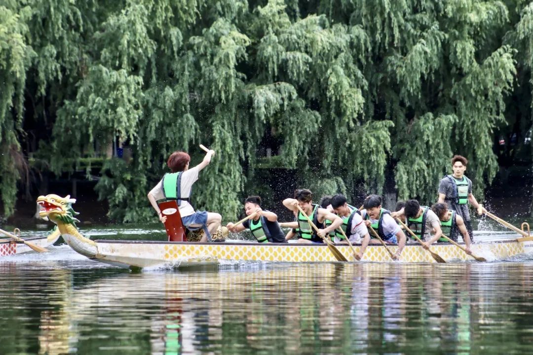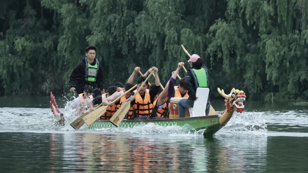 各参赛队伍随即到北潭展开角逐。号令响起,鼓声阵阵,船桨翻飞,水花四溅,各队奋力挥桨,展现出速度与力量的比拼。比赛期间虽有小雨,但现场师生热情不减。湖面上参赛队员奋力拼搏,岸上观赛师生撑伞助威,加油声此起彼伏。