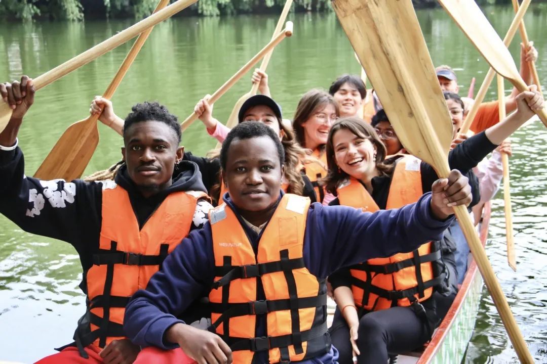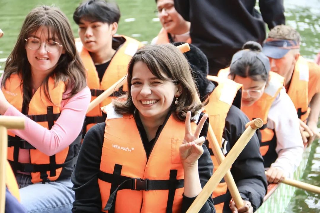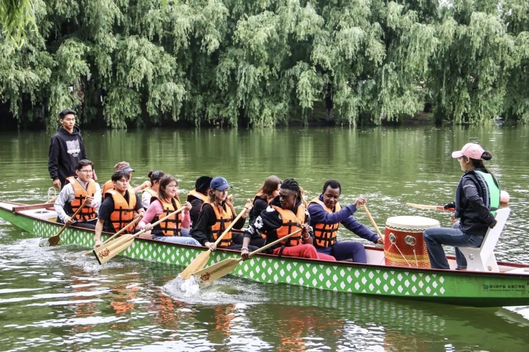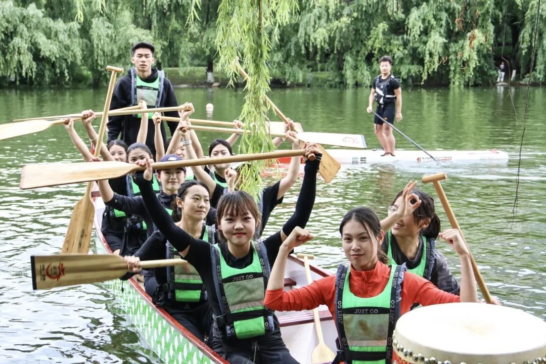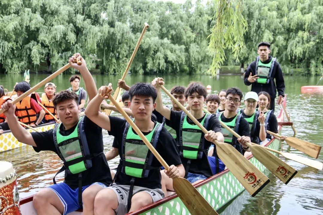 各参赛队伍随即到北潭展开角逐。号令响起,鼓声阵阵,船桨翻飞,水花四溅,各队奋力挥桨,展现出速度与力量的比拼。比赛期间虽有小雨,但现场师生热情不减。湖面上参赛队员奋力拼搏,岸上观赛师生撑伞助威,加油声此起彼伏。