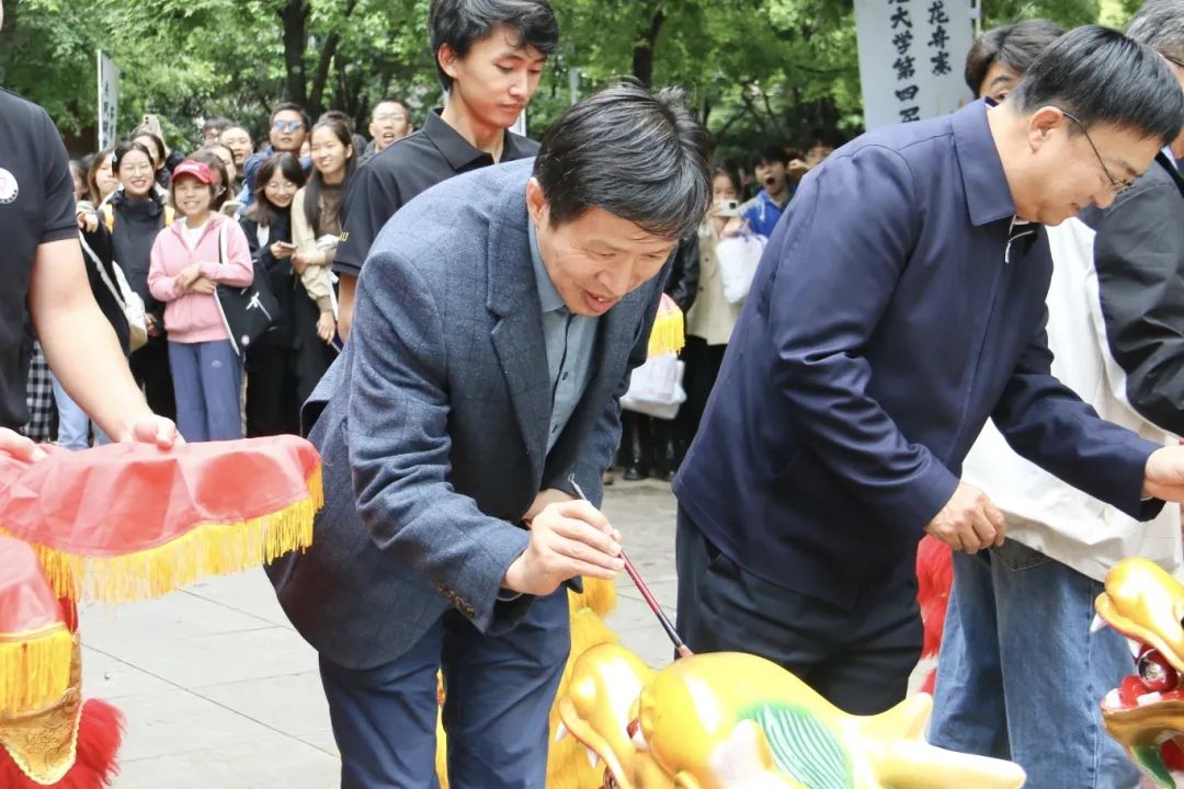 校领导及相关单位负责人一同为龙舟点睛。彩色烟花腾空而起,胡金明宣布比赛开幕。