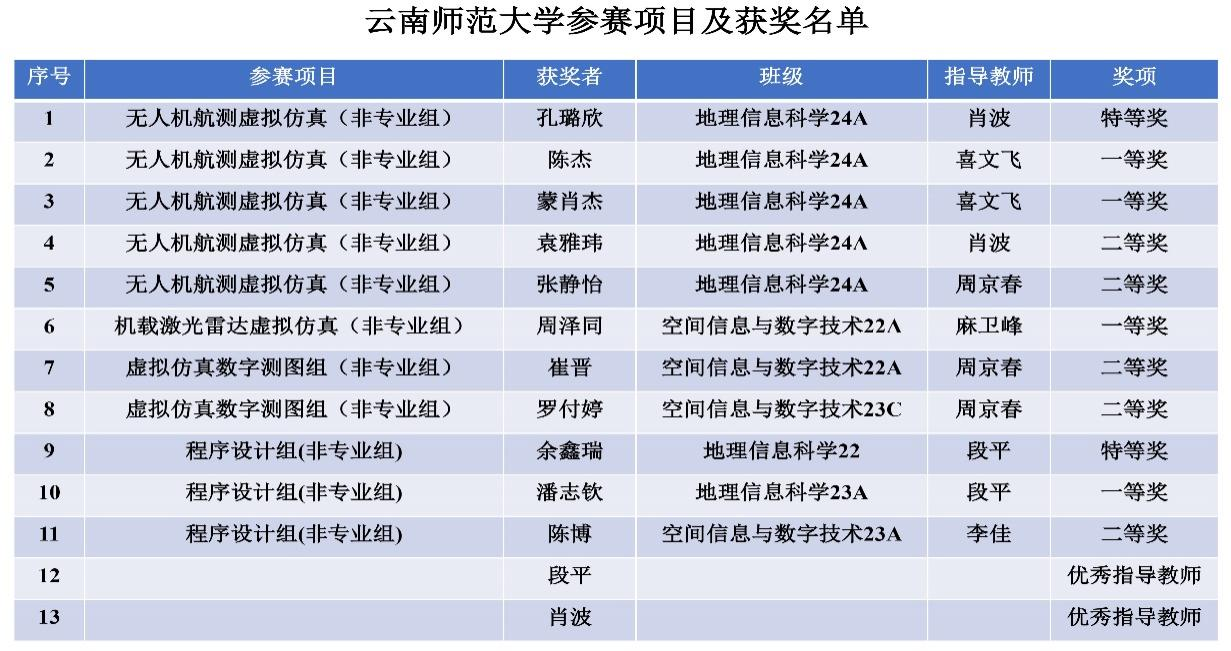 在赛前准备阶段,地理学部精心组织,为参赛团队提供训练场地和设备支持。在指导教师的专业指导下,选手们通过系统化模拟实训不断提升技能水平。经过激烈角逐,学部学子在多个赛项中表现优异:孔璐欣、陈杰、蒙肖杰、袁雅玮、张静怡分获无人机航测虚拟仿真组(非专业组)特等奖、一等奖、二等奖;周泽同获机载激光雷达虚拟仿真组(非专业组)一等奖;崔晋、罗付婷获虚拟仿真数字测图组(非专业组)二等奖;余鑫瑞、潘志钦、陈博同学分获程序设计组(非专业组)特等奖、一等奖和二等奖。段平、肖波两位教师获“优秀指导教师奖”。