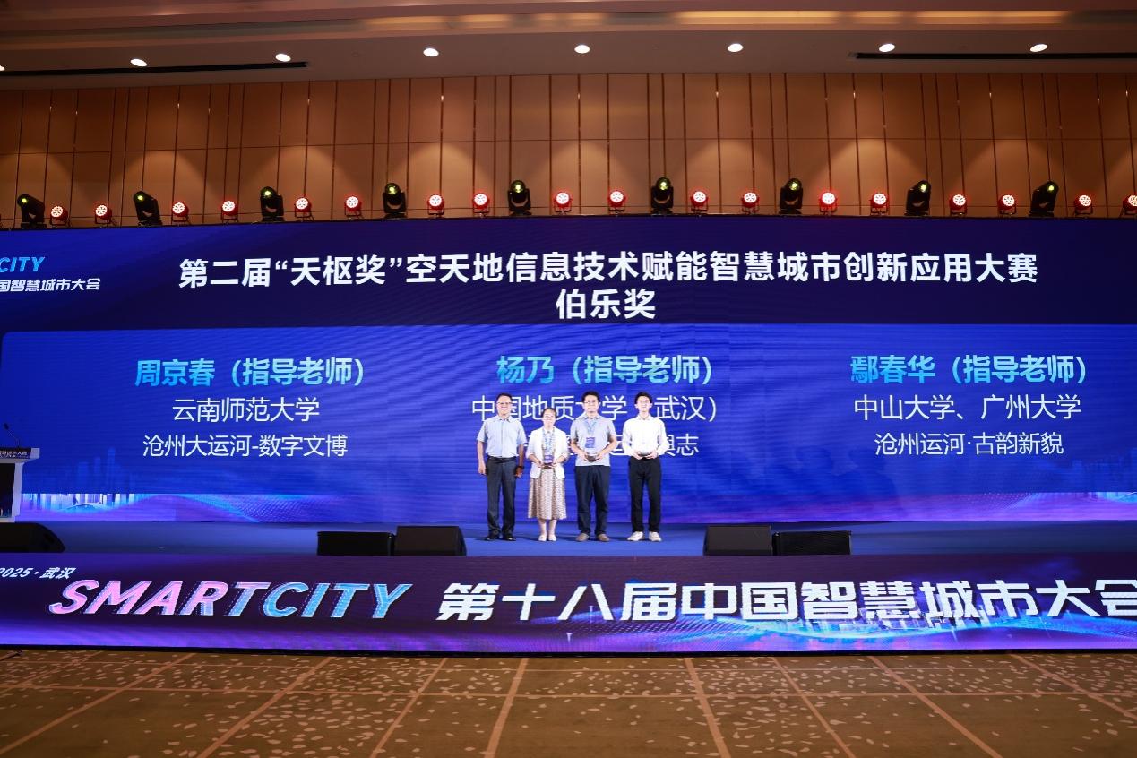 6月26日至28日,第二届空天地信息技术赋能智慧城市创新应用大赛在武汉举行。必赢官网地理学部本硕学生团队提交的“千年运河沧州记忆”数字文博作品获大赛最高奖项“天枢奖”,指导教师周京春教授获“伯乐奖”。