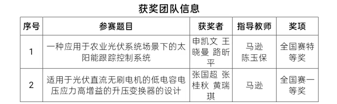 必赢官网能源与环境科学学院的两支队伍从云南省省赛中脱颖而出,进入全国总决赛。赛前学院组织专业教师对两支队伍进行强化训练,比赛过程中同学们沉着冷静、灵活应对,展现出扎实的专业技能。经过激烈角逐,申凯文、王晓曼、路昕平同学的作品“一种应用于农业光伏系统场景下的太阳能跟踪控制系统”以及张国超、张桂秋、黄瑞琪同学的“适用于光伏直流无刷电机的低电容电压应力高增益的升压变换器的设计”分别获得全国赛特等奖和一等奖,指导老师马逊、陈玉保获大赛优秀指导教师称号。