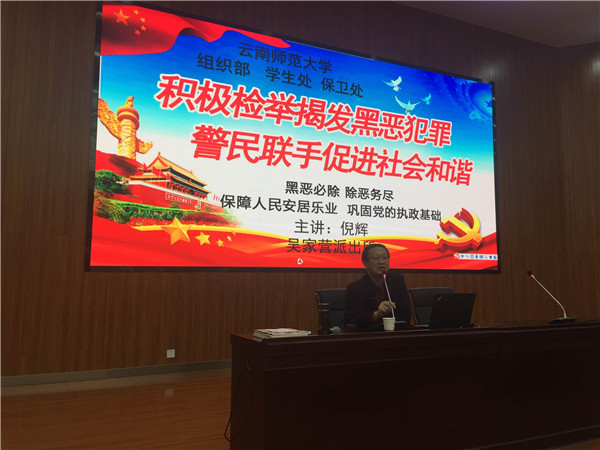 倪辉警官结合自身从警经历,深刻剖析了发生在呈贡大学城各高校大学生们身边的真实案例,提醒广大师生防校园贷、防火、防盗、防诈骗、防传销、防交通事故、遵守法律法规、保护人身安全。